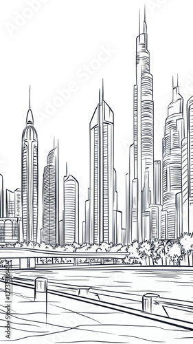 Fototapeta premium Dubai Skyline Black and White Coloring Page for Adults - UAE Cityscape Vector Art