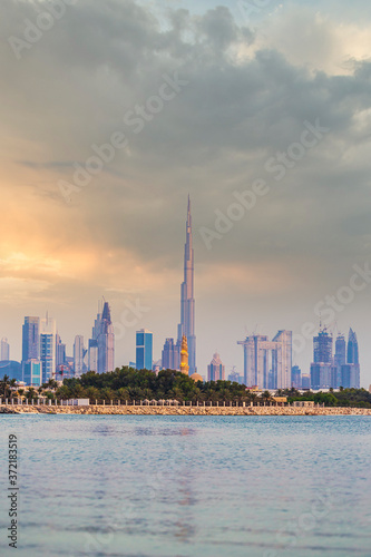 Obraz premium Dubai skyline lakeview during cloudy sunset
