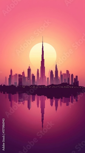 Fototapeta premium Dubai Skyline Sunset Cityscape Reflection