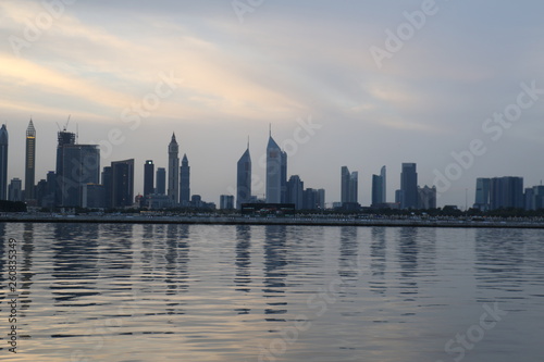 © Abrar, Fototapeta premium Dubai Skyline under Cloudy Sky, Dubai Downtown Residential and Business Skyscrapers, a view from Dubai Water Canal, Dubai, United Arab Emirates