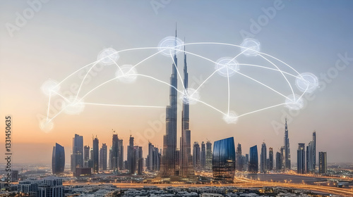 Obraz premium Dubai skyline with interconnected nodes
