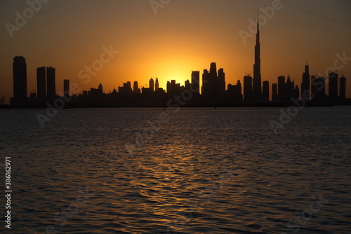 Obraz premium Dubai slyline from Dubai Creek Harbour and Dubai canal to Downtown and...