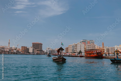 © Евгения Жигалкина, Obraz premium Dubai, UAE - April 15, 2021: Cityscape view of Dubai Creek channel with old wooden traditional boats cruising and piers. Sunny summer day. Famous tourist destination in UAE, United Arab Emirates. Abra