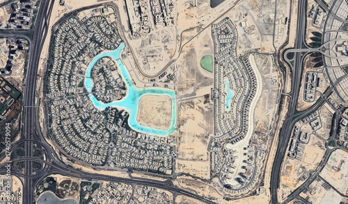 © Aerial View, Fototapeta premium Dubai, UAE: High-Resolution Aerial View of Modern Coastal Cityscape and Urban Development