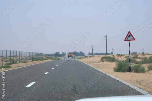 © miles_around, Fototapeta premium DUBAI, UNITED ARAB EMIRATES - JUN 16, 2019: Wild dromedary or adult Arabian camel crossing the road in the far distance in the middle of the desert with sand dunes in the background