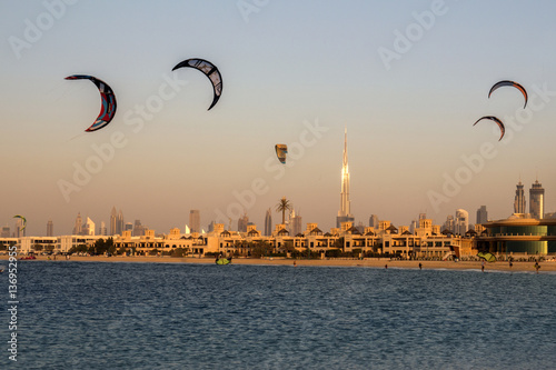 Obraz premium Dubaj plaża kitesurfing i panorama panoramę
