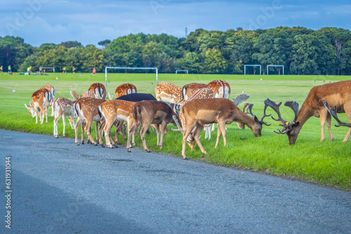 Naklejka premium Dublin, Ireland - July 12 2023 - "Deer in Dublin's Phoenix Park"