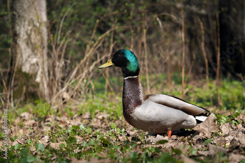 © kozorog, Fototapeta premium Duck drake walks in the woods. Spring