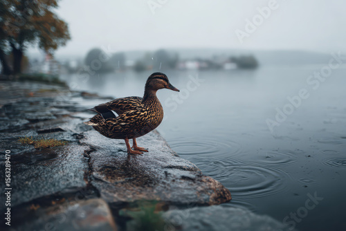 Fototapeta premium Duck on wet stone beside lake rain creating small ripples