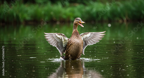 © Marina, Fototapeta premium Duck spreading wings in a serene pond
