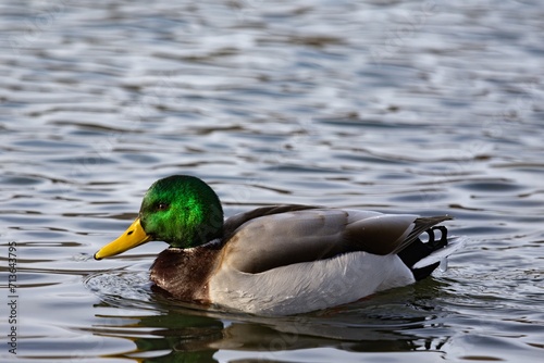 Fototapeta premium Duck swimming in pond during winter