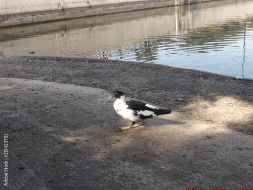 © Jimmy, Fototapeta premium Duck taking a walk on sidewalk by lake.