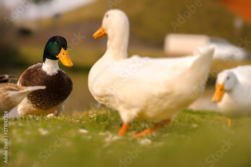 © Fernando Leon , Obraz premium Ducks eating in the sunset