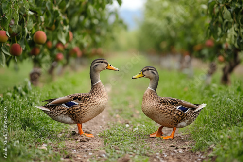 Fototapeta premium Ducks in an Orchard Path