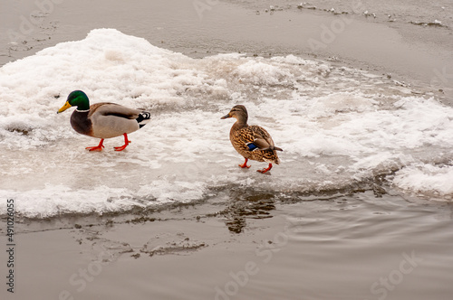 Naklejka premium Ducks in early spring on the waterfront!