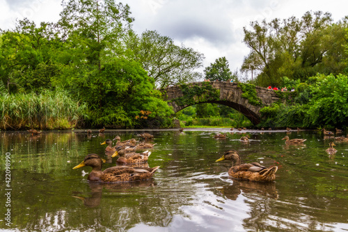 © Mirko, Fototapeta premium Ducks in the pond and the Gapstow Bridge in Central Park
