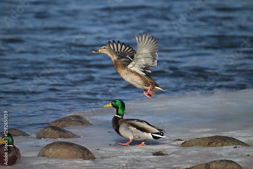 © Peter, Obraz premium ducks on the water, winter river, Mallard, take up