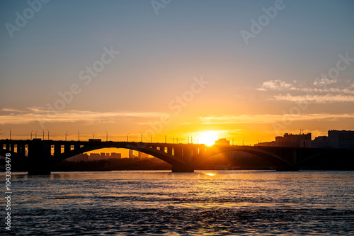 © Павел Чигирь, Fototapeta premium ducks swim in the Yenisei at sunset against the background of the communal bridge