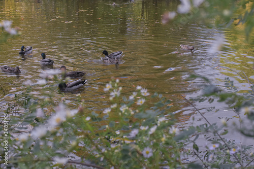 Fototapeta premium ducks swimming in a park pond on a spring afternoon with flowers in the...