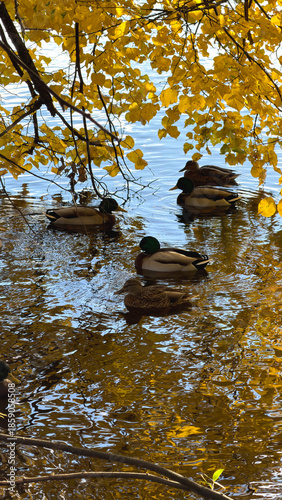 © Aleksander, Naklejka premium Ducks swimming in a pond surrounded by autumn leaves.