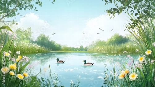 © Anat art, Fototapeta premium Ducks swimming peacefully in a serene pond surrounded by lush greenery and blooming wildflowers in bright daylight. Generative AI