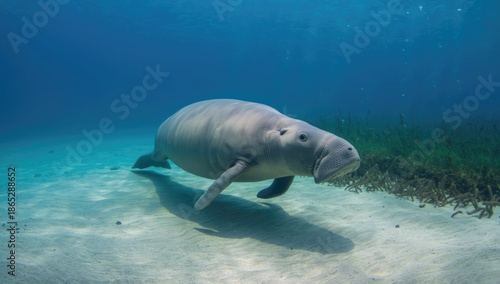 Fototapeta premium Dugong diving through shallow coastal waters, highlighting marine ecosystem...