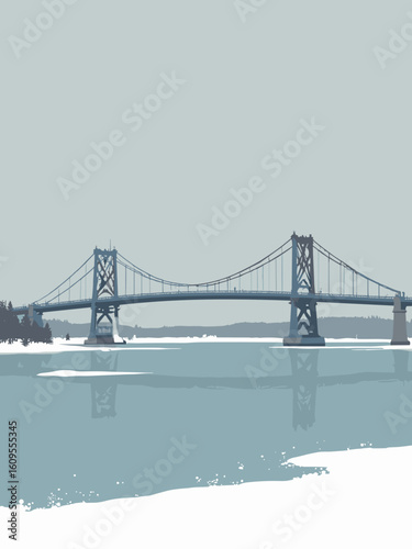 © Sabry, Fototapeta premium Duluth, MN – Aerial Lift Bridge over icy harbor in steel gray, ice white, lake blue, and overcast silver