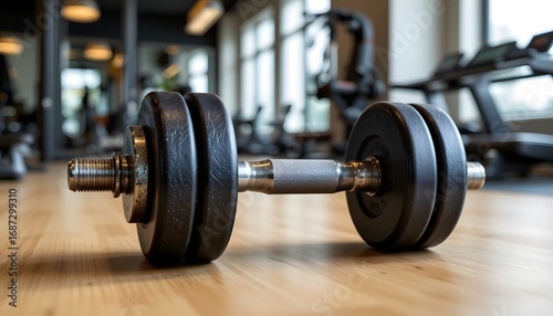 © Guy, Naklejka premium Dumbbell and Gym Equipment: A close-up shot of a dumbbell lies on the wooden floor in a well-equipped gym, hinting at exercise, strength training, and personal fitness.