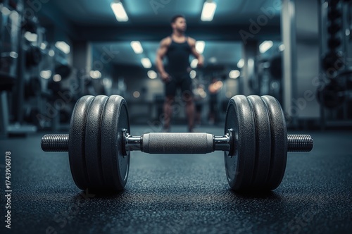 © GenZGraphics, Naklejka premium Dumbbell resting on the workout floor with fitness and health themes