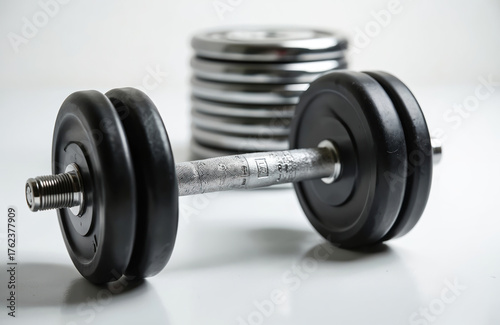 Naklejka premium Dumbbell weights with barbell plates stacked. Metal iron equipment for strength training. Build muscle power, tone body, lose weight in gym. Get fit.