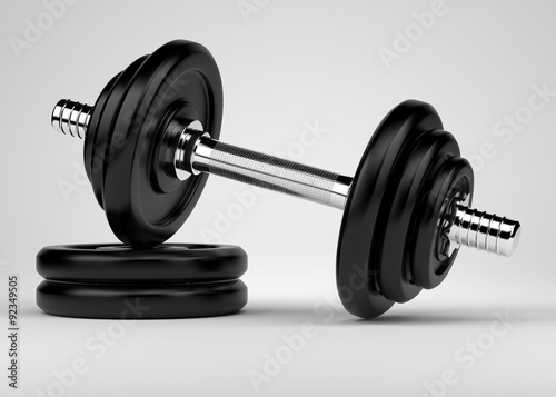 © Whitebarbie, Naklejka premium Dumbbell with chrome handle. Free weights to workout in gym.