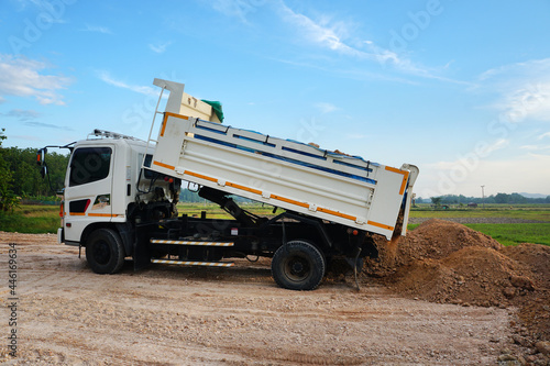 © Montree, Obraz premium Dump truck unloading process on construction site.