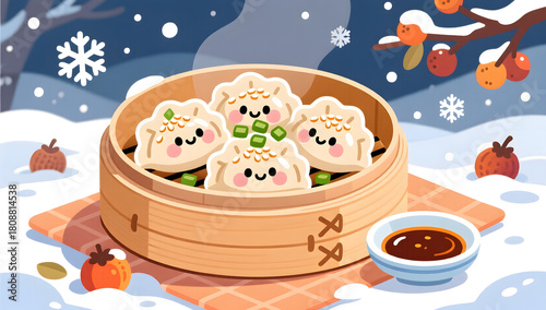 © lin, Obraz premium Dumplings with sesame and scallion in steamer for Winter Solstice