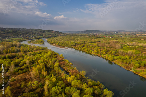 Obraz premium Dunajec River in Lesser Poland at Spring Morning. Aerial Drone View