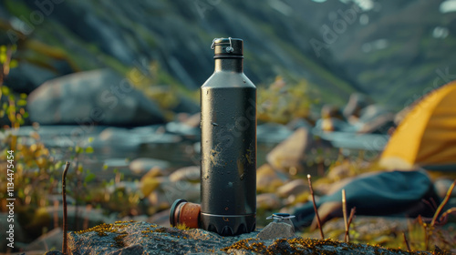 © NooPaew, Obraz premium Durable bottle mock-up with rugged design, set on a camping site background