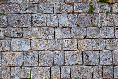 © Silga, Fototapeta premium Durable stone wall featuring a textured surface with a unique pattern, showcasing the beauty of outdoor paving and design elements in a functional way with copy space