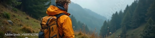Naklejka premium Durable, waterproof camping jacket with hood, perfect for hiking and outdoor...
