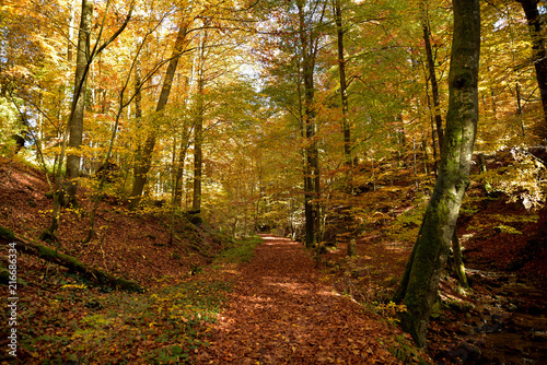 © Fotolla, Naklejka premium Durch einen idyllischen Herbstwald mit bunten Blättern