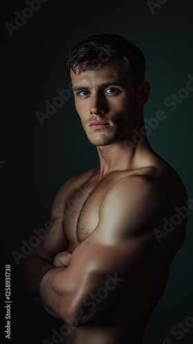 © Cedric, Naklejka premium Durchtrainierter Mann in sportlicher Pose vor dunklem Hintergrund