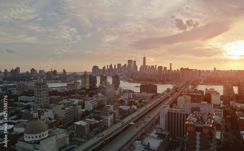 Obraz premium During sunset is panoramic view visible Manhattan across East River crossed...