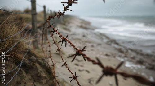 © AkuAku, Obraz premium During the Normandy landings in World War II metal barbed wire served as a vital protection measure along the beaches