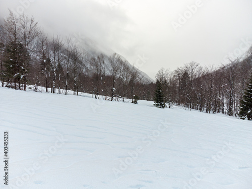 © Nicola Simeoni, Naklejka premium During the snowfall in the mountains. View from above.