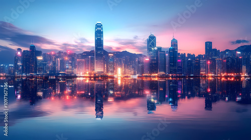 © Thiago, Fototapeta premium Dusk city skyline with neon reflections and illuminated skyscrapers. Dreamlike Skyline Reflections. Illustration