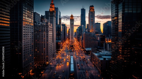 Fototapeta premium Dusk Cityscape with Glowing Skyscrapers