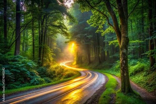 © vekin, Fototapeta premium Dusk Forest Dirt Road Long Exposure Photography - Mystical Woodland Path