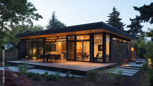 © Intach, Fototapeta premium Dusk settles over a stylish prefabricated house, with subtle outdoor lighting framing the structure.