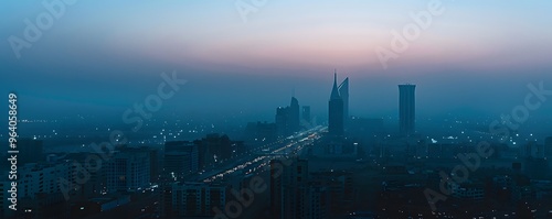 © rehan, Fototapeta premium Dusk Skyline with Hazy Atmosphere and Traffic