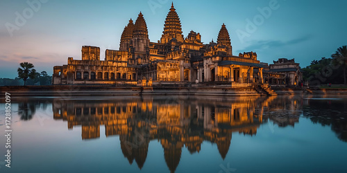 © Muskan, Fototapeta premium Dusk View of Angkor Wat with Golden Illumination