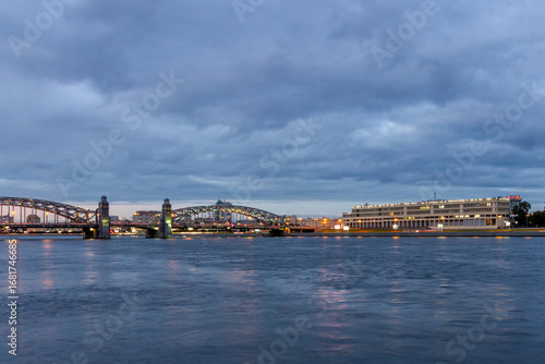 © Vlad Rakin, Naklejka premium Dusk view of illuminated Bolsheokhtinsky Bridge over Neva River with city lights reflection in water. Saint Petersburg, Russia.