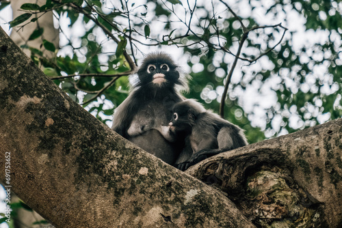 © Iurii, Fototapeta premium Dusky leaf monkey breastfeeds her baby